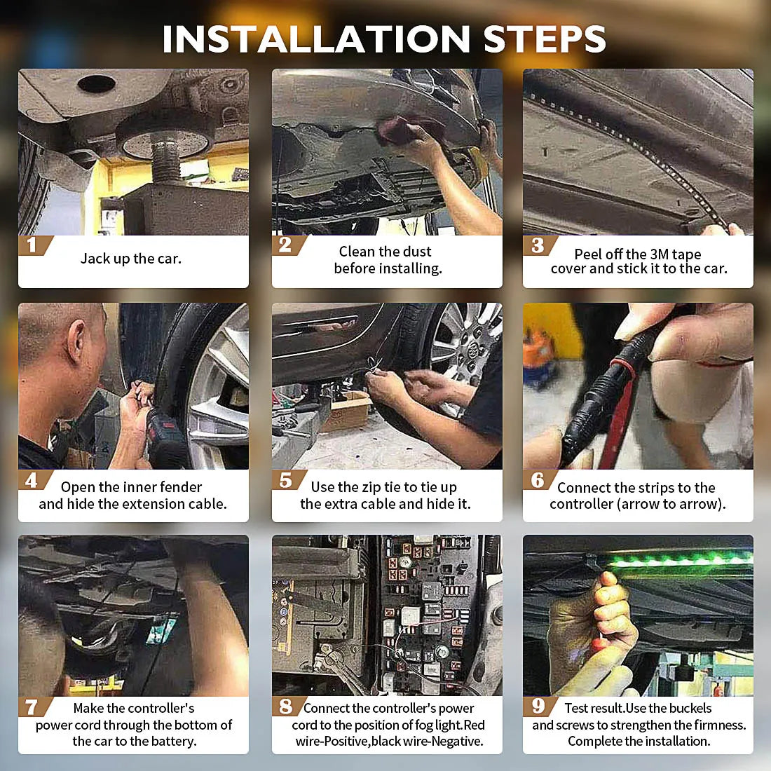 - Attach the LED strips under your car using the adhesive or mounting clips.